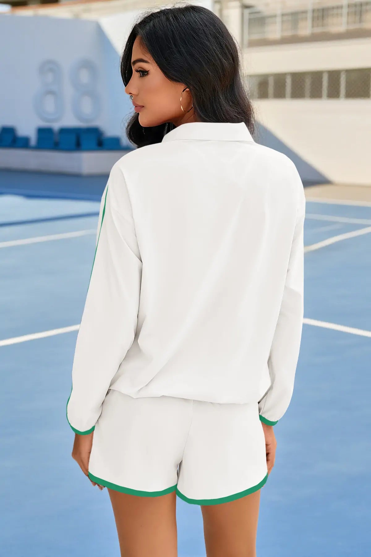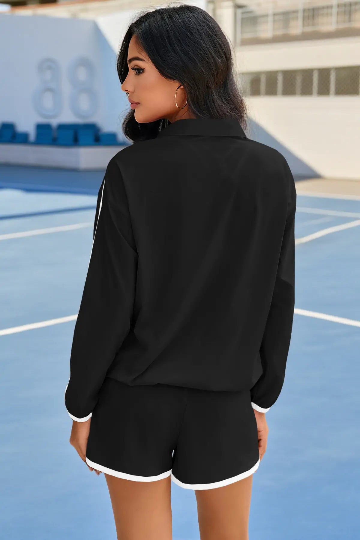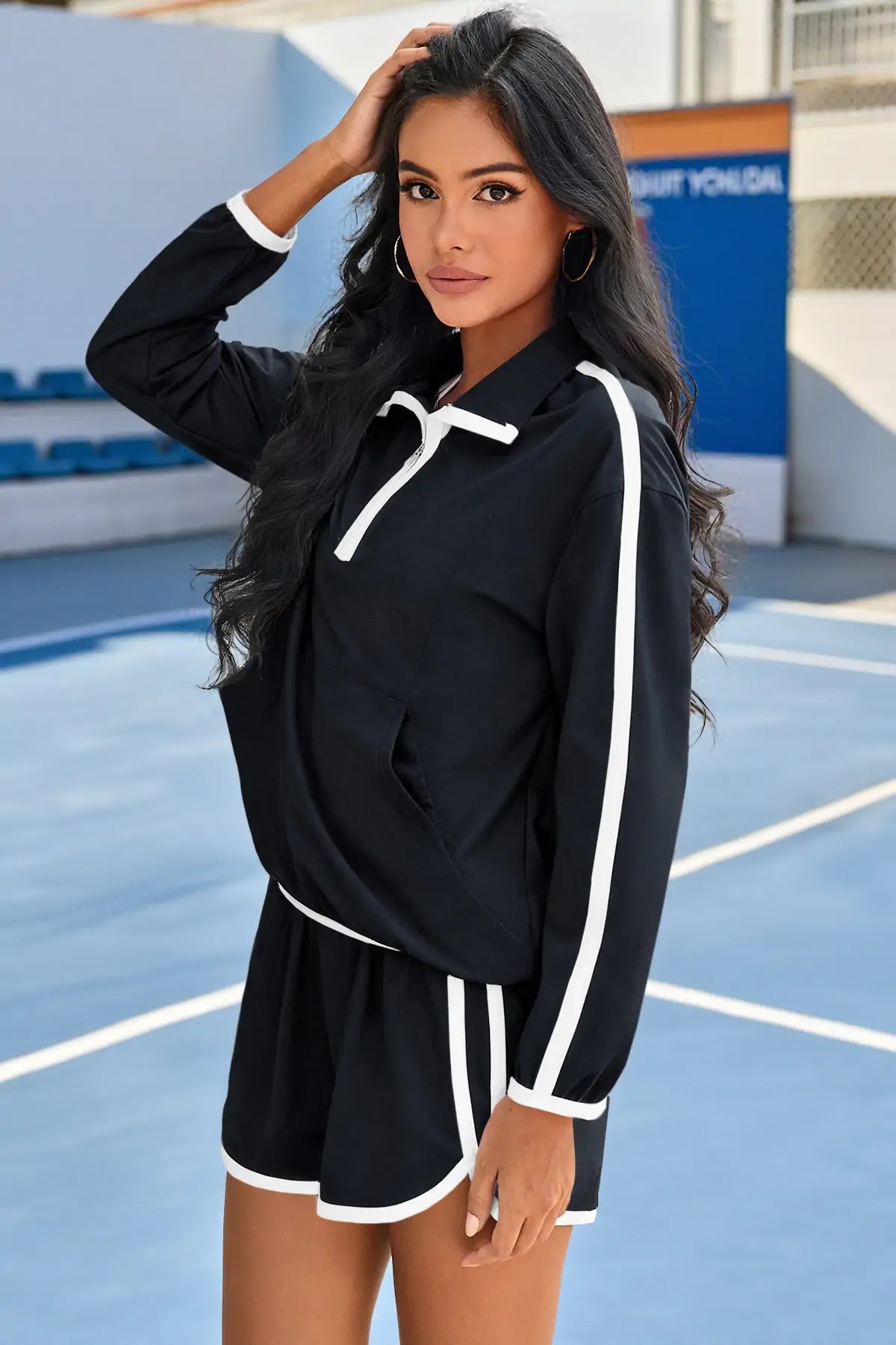 Modern stand collar with zip V-neck offers a sleek, sporty look. Contrast stitching design create a bold, eye-catching style.Elastic waistband with adjustable drawstring ensures a secure, customizable fit for all body types